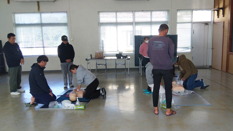 この安全講習会は日本財団様からの支援を受けた中で開催されています。当日は午前/午後2回に分かれて学科講習/CPR実習実技講習が行われ、今回は協会員の皆様16名参加となりました。